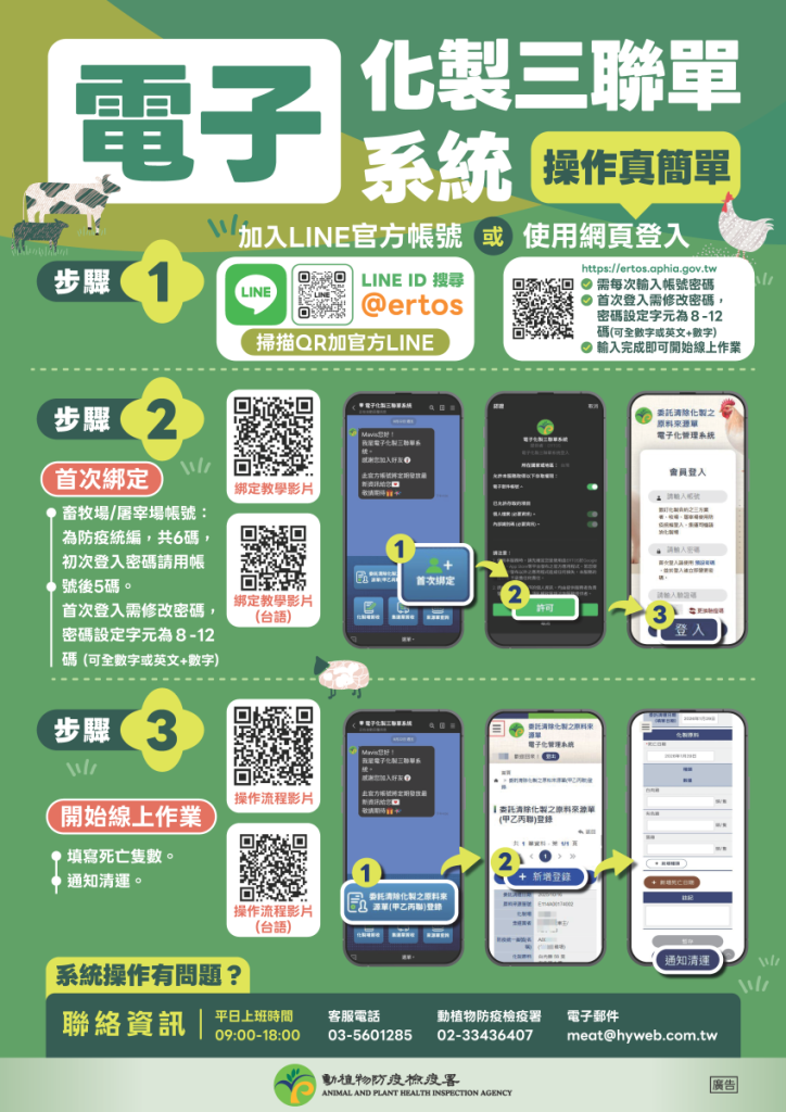 國語版 https://youtube.com/shorts/mPKo1RDgEKk?feature=share 台語版 https://youtube.com/shorts/iiEgd5dbAz8 You Might Also Like 貼心提醒疫苗接種事項說明 2024 年 6 月 27 日 ★2050年農業淨零臺丹國際研討會IV-從生命週期評估畜牧業碳足跡與減碳策略 2024 年 6 月 5 日 2月11日雲林縣動植物防疫所辦理宣導電子化三聯單說明會各水禽業者請踴躍參加(請攜帶手機或平板以便現場指導) 2026 年 2 月 5 日
