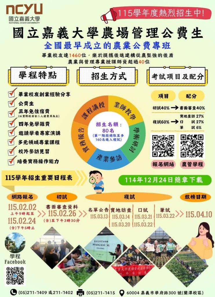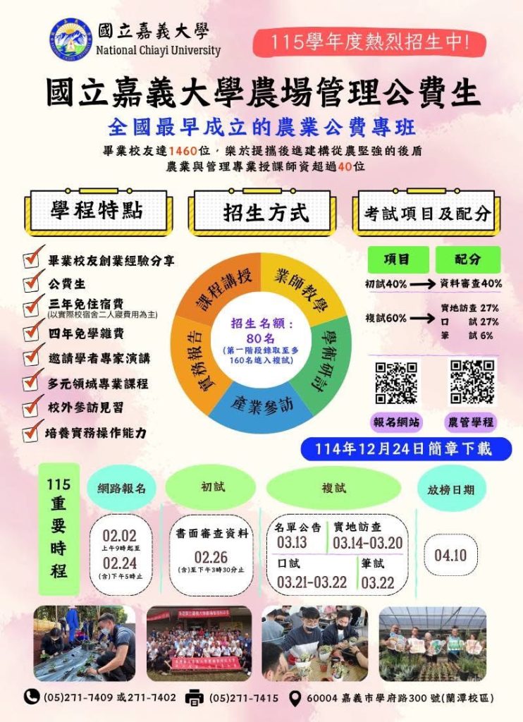 歡迎至嘉大首頁,點選招生資訊,左下角網路報名與簡章下載區免費下載,報名日期自2月2日起至2月24日止,離報名日期尚有2週,歡迎有志從農之在校高中職學生與從農之青農,盡早準備備審資料,相關資訊若有不清楚處也可洽詢052717409農管辦公室楊助理。附上招生海報,歡迎轉傳,讓有志從農之學生,都能得知此訊息,而有更充裕時間準備備審資料。 You Might Also Like 嘉義及屏東禽場確診H5N1高原病性禽流感,請業者落實各項生物安全工作 2023 年 7 月 21 日 畜產試驗所「種畜禽耐病手冊」提高種畜禽耐病性,減少動物用藥量 畜產新聞 2024 年 6 月 14 日 農曆期間向為國內肉品消費旺季,為防範斃死畜禽非法流用情事發生,請業者妥適處理斃死畜禽,切勿任意棄置遭非法流用,影響產業形象。 2025 年 1 月 9 日