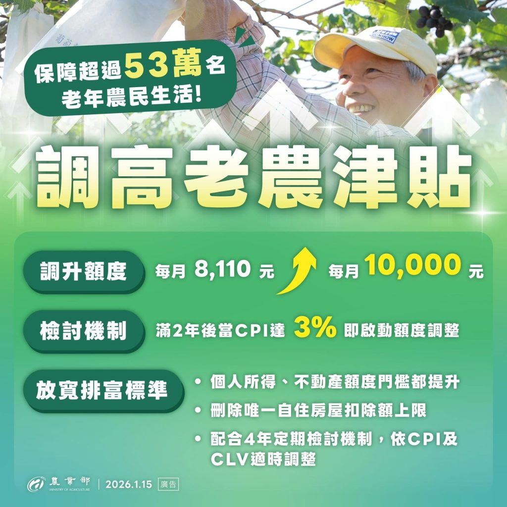 除了 #津貼將調升到1萬元,老農條例的修正週期,將搭配物價指數成長率(CPI)調整機制,滿2年後當CPI達3%即啟動檢討。 此外,依據實務狀況,政府 #放寬排富條件,除了個人所得及不動產額度都調升門檻,農民唯一自住房屋扣除額,也將不列入排富,未來每4年將依照CPI成長率及公告土地現值增幅(CLV)調整排富標準,照顧更多農村長者的晚年生活。 政府繼續努力,照顧為這片土地付出的農民! You Might Also Like 114 年高雄市政府農產業智慧農業補助計畫 2025 年 3 月 12 日 農業部獸醫研究所學術研討會–第969次 2025 年 7 月 12 日 為鼓勵壯農持續營農及對接產業發展 農業部預告修正農貸辦法 2024 年 8 月 7 日