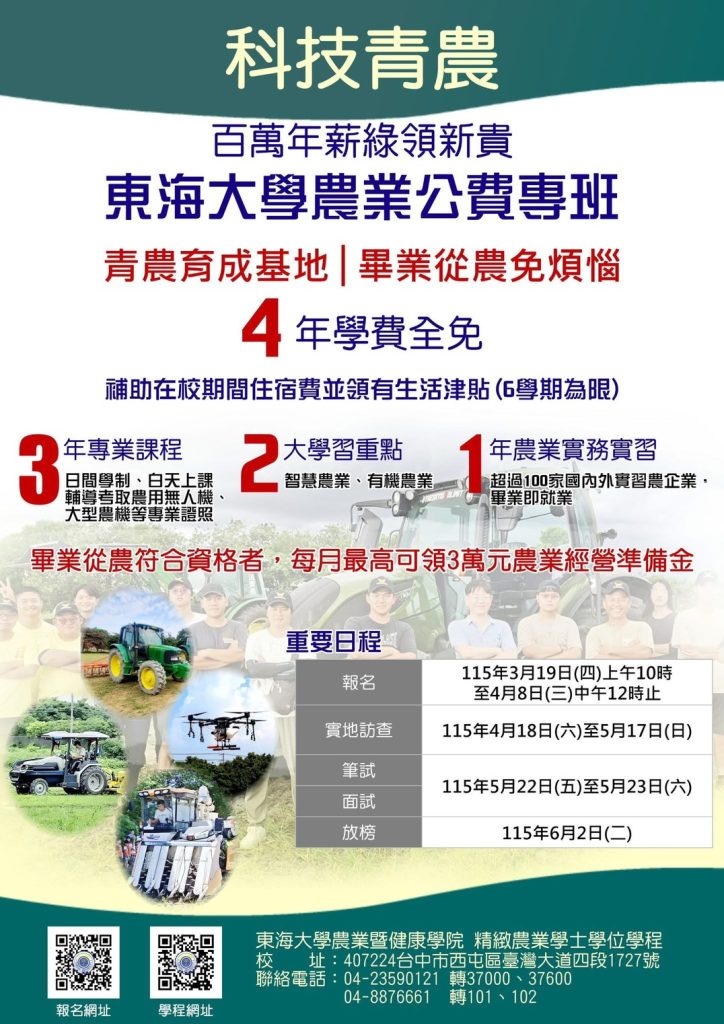青農育成基地 – 畢業從農免煩惱歡迎有志從農的您加入……..準備報名……報名日期 : 115年3月19日(四) 至 4月8日(三) You Might Also Like 112年度養鵝場禽流感防治宣導教育講習會 高雄地區 2023 年 10 月 14 日 113年度辦理六場次-動物運送人員職前/在職講習訓練班課程表與報名資訊 2024 年 8 月 2 日 112年「輔導養禽場禽舍改建升級補助相關資料」請於5/29將申請書逕送雲林縣政府 2021 年 1 月 9 日